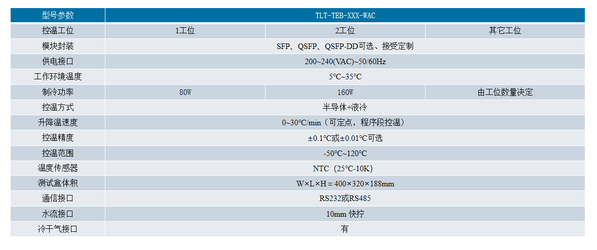 本系列的“雙工位測試盒”是建立在半導體制冷片(熱電制冷片)基礎上設計的高性能溫度控制系統(tǒng),其特點是高精度和高穩(wěn)定度、長壽命、體積小、無噪聲、無磨損、無振動、既可制冷又可加熱等優(yōu)點。 控溫速度快,溫度均勻性好,常溫25℃降至-45℃時間為小于150S,遙遙領先行業(yè)。該設備可以廣泛應用于光模塊、光器件及其組件、小型和微型化封裝的電子產(chǎn)品,在研發(fā)、生產(chǎn)各個環(huán)節(jié)的高低溫測試中。該儀器具備如下特點,能有效幫助企業(yè)提高生產(chǎn)效率、降低生產(chǎn)成本、提升產(chǎn)能。解決了當前行業(yè)通用方法/儀器應帶來的各種弊端和不足。